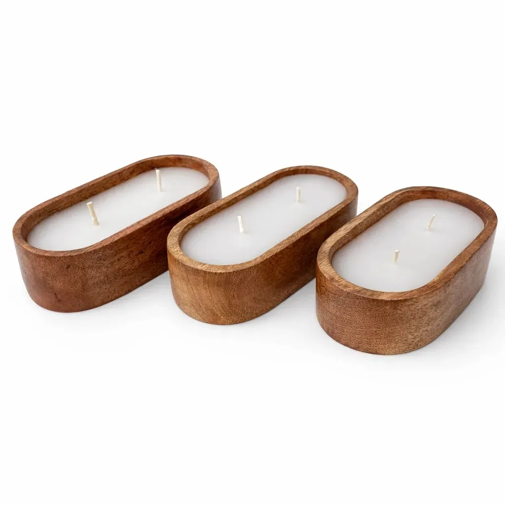 BT-09 Handcrafted Wooden Scented Candle Set of 3 – Premium Oval Shape Multi-Wick Candles in Wooden Bowls