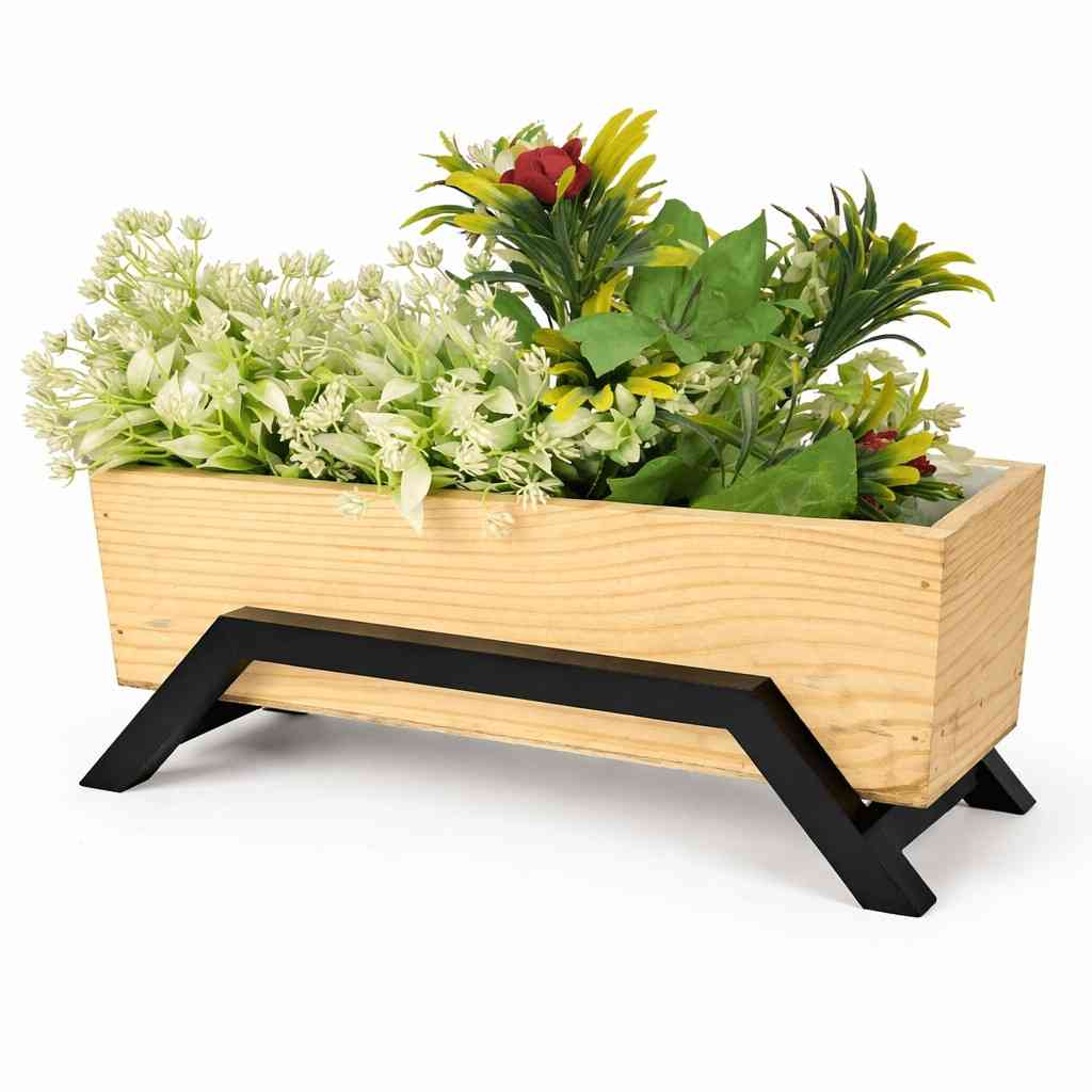 Features a solid black metal stand that provides stability while adding a sleek contemporary contrast to the wooden planter.